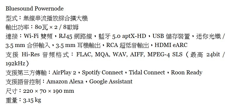 PowerNode 搭載 BluOS 串流平台,支援多種主流音樂串流服務與高解析音樂格式,操作流暢、反應快速,透過手機、平板或電腦即可輕鬆控制。對於不想被器材堆滿空間、又希望音質明顯優於藍牙喇叭與 Soundbar 的使用者而言,PowerNode 是兼顧便利性與聲音表現的理想選擇。