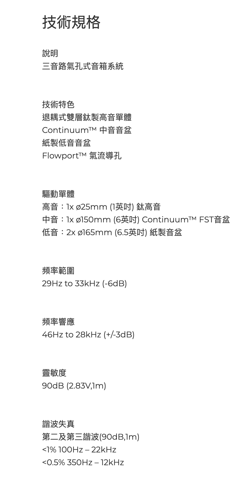 Bowers & Wilkins 603 S3 是 B&W 600 Series S3 系列中體型最大、聲音規模最完整的落地喇叭,專為希望在預算與空間條件內,獲得真正落地喇叭表現的音樂愛好者所設計。603 S3 採用鈦金屬 Dome 高音單體,高頻延伸清楚、明亮卻不刺激;Continuum 中音振膜則讓人聲與樂器質感自然、密度適中,聲音輪廓清晰不混濁。雙低音配置提供充足的低頻量感與良好下潛,使整體聲音更有規模感與動態表現,特別適合流行、人聲、電影原聲與多元音樂類型。在聲音取向上,B&W 603 S3 保有品牌一貫的平衡與清晰度,不刻意渲染,卻能讓細節自然浮現。