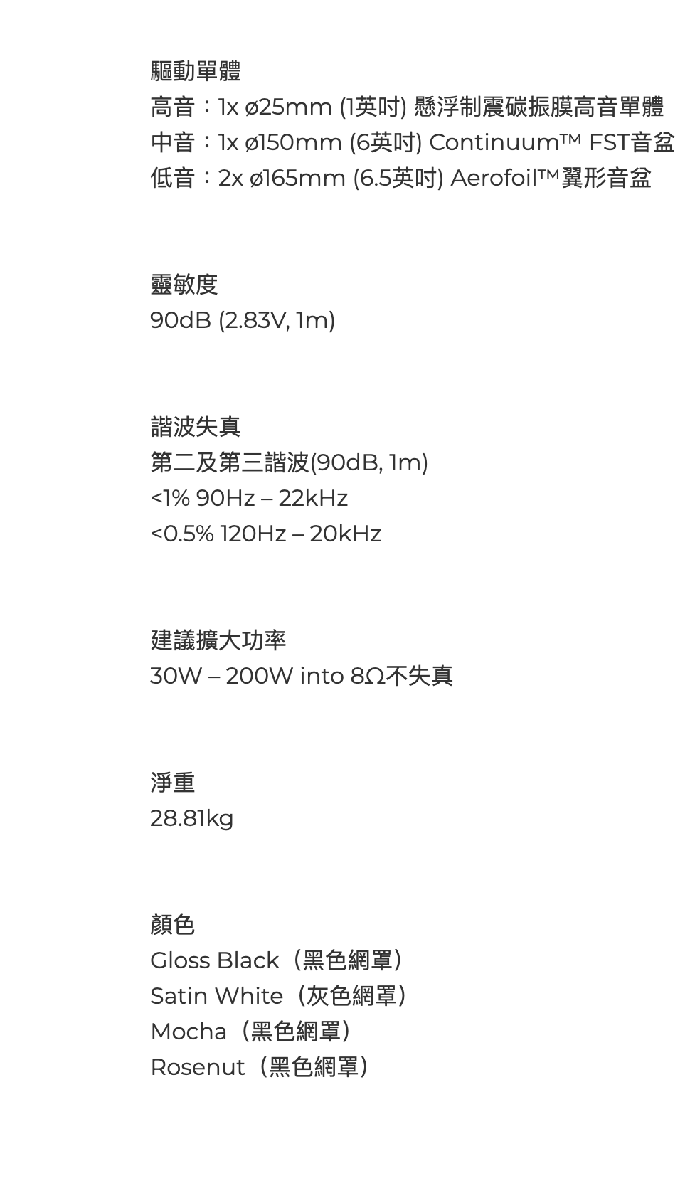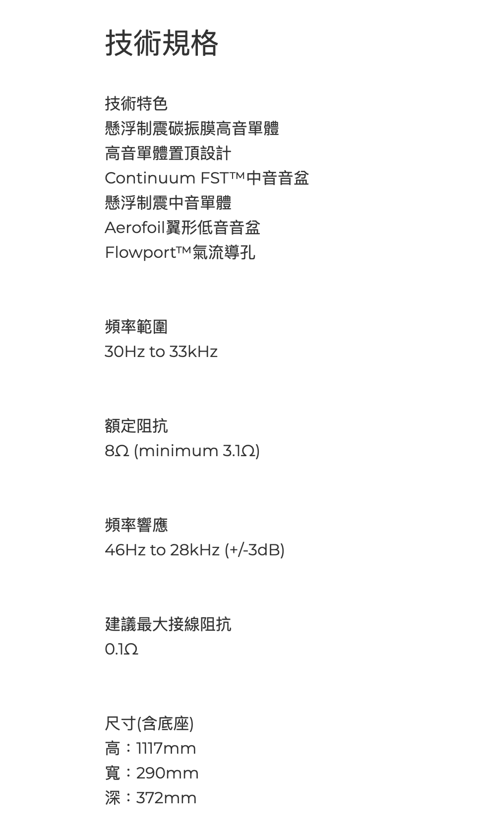 B&W 703 S3 為 700 Series S3 系列中的三音路落地式喇叭,採用 Carbon Dome 高音、Continuum FST 中音與雙 165mm Aerofoil Profile 低音單體,兼具細膩解析、自然人聲與紮實低頻。相較較小型號,703 S3 能建立更完整音場與動態規模,適合中大型空間兩聲道聆聽或高階家庭劇院主聲道。台北音響提供實體展示與試聽服務。