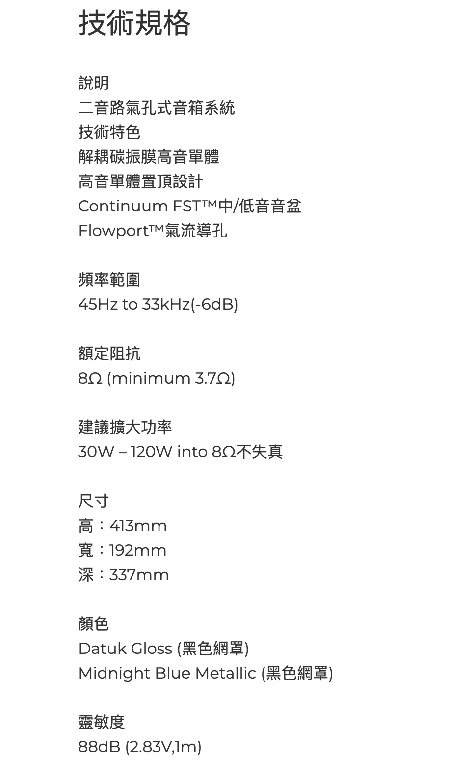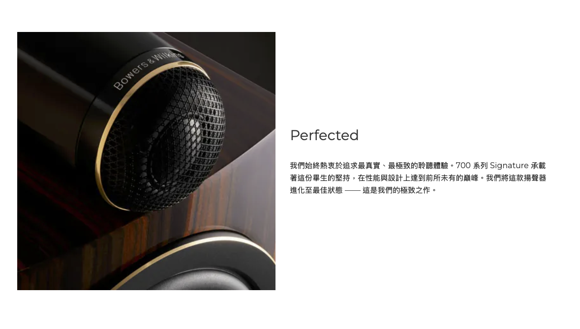 Bowers & Wilkins 705 S3 Signature 是 B&W 700 Series S3 書架喇叭中的旗艦版本,專為追求更高音質密度、更細膩層次與更準確音像表現的玩家所打造。Signature 版本在關鍵元件與調音上進行升級,使聲音在原本清晰平衡的基礎上,進一步提升細節解析、背景純淨度與音像凝聚力。碳振膜高音搭配獨立高音艙體,讓高頻延伸自然順暢、不刺激;Continuum 中低音則讓人聲與樂器質感更加真實、立體。705 S3 Signature 能在有限空間中展現接近落地喇叭的音場規模與定位精準度,是高階兩聲道書架系統的理想選擇。