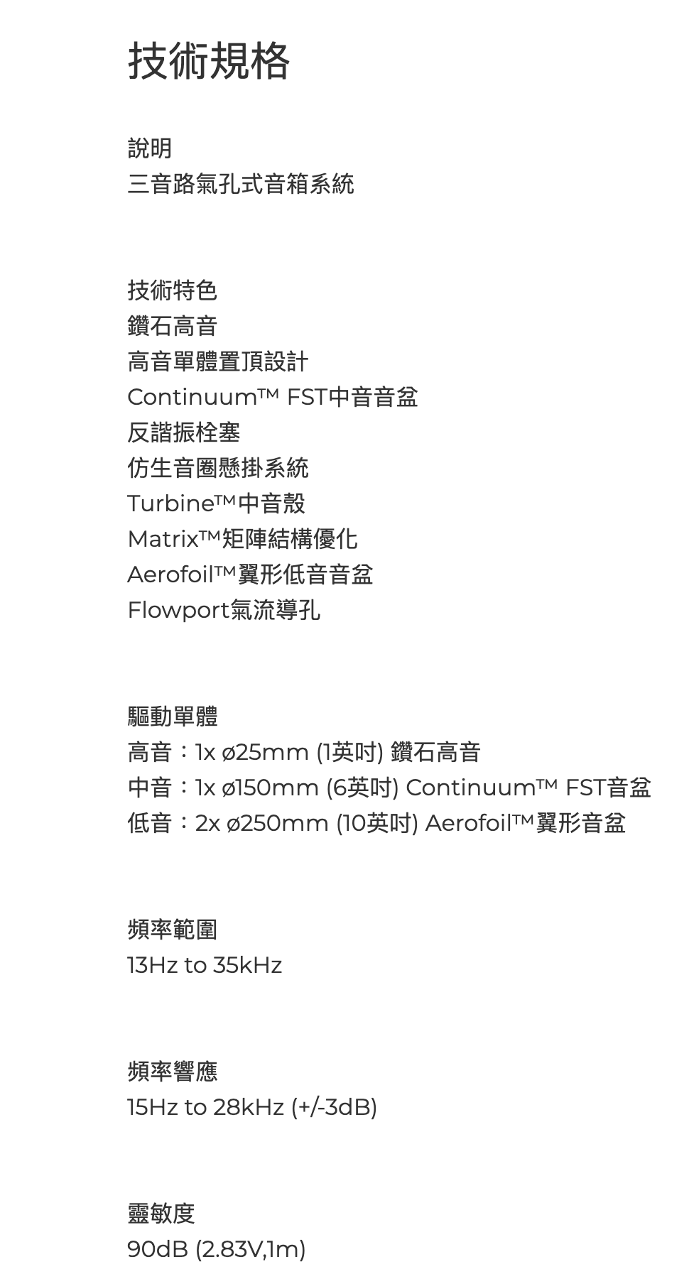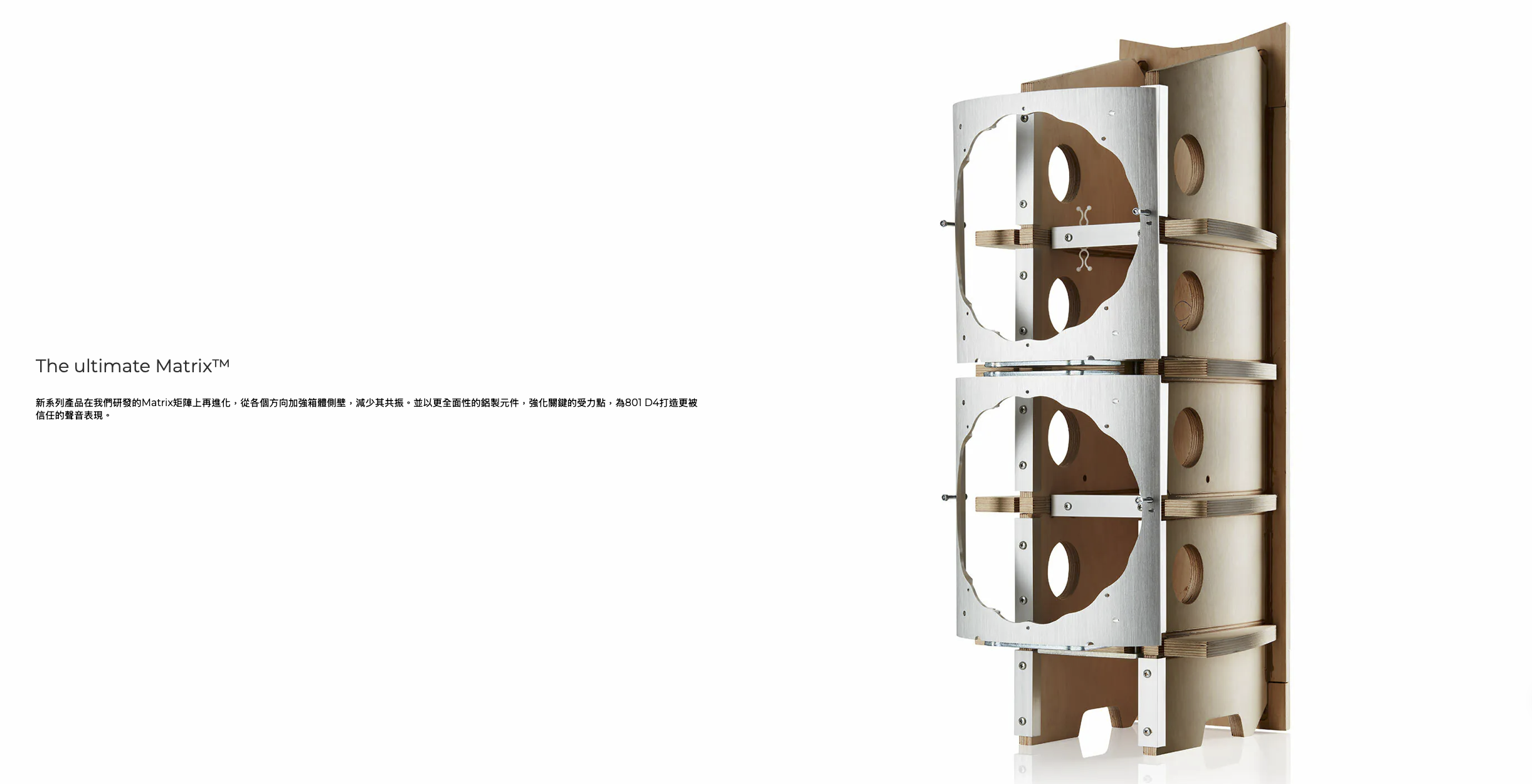 鑽石高音單體提供極高延伸與細節解析,Continuum 中音讓人聲與樂器質感自然立體,而大口徑低音單體則帶來龐大卻受控的低頻能量。801 D4 能在高音壓下仍維持低失真,展現真正旗艦喇叭應有的從容與穩定。