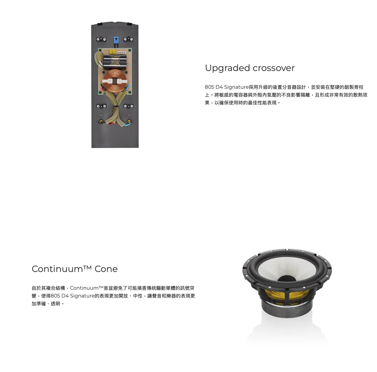 B&W 805 D4 Signature 是 Bowers & Wilkins 800 Series Diamond 中最具收藏價值與音樂性的書架喇叭版本。延續鑽石高音與 Continuum 中低音的核心技術,並針對分音器元件、內部線材與箱體調校進行全面升級,使聲音背景更乾淨、細節更清晰、層次更立體。Signature 版本在中高頻細膩度、空氣感與音場穩定性上,明顯優於標準版 805 D4,特別適合注重音色質感、人聲真實度與長時間聆聽的用家。台北音響提供完整系統搭配建議與試聽服務,協助發揮其最佳表現。