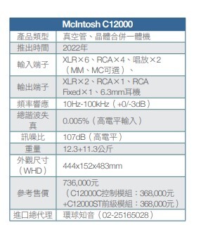 McIntosh C12000 為品牌旗艦雙機前級,真空管與晶體放大獨立設計,實現絕對音色純度與可調性。全平衡雙機架構、頂級元件與專利音量控制電路,帶來極低失真與寬廣音場。體現McIntosh七十年聲學精髓。台北音響現正展示販售,邀您體驗極致音樂控制力。