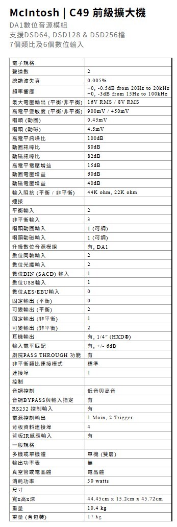 McIntosh C49 是品牌旗艦前級擴大機的巔峰之作,融合 真空管音色的溫潤 與 晶體電路的精準,帶來極低失真與寬廣動態。全平衡架構搭配高精度音量控制電路與專業分離式電源設計,確保聲音層次清晰、音場深邃,完美呈現古典、人聲、爵士及黑膠音樂的原貌。