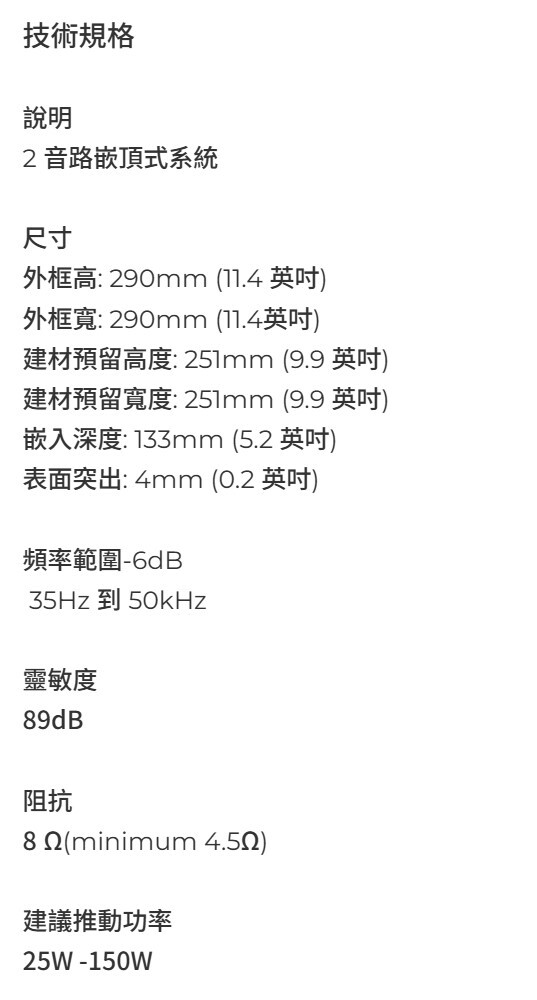 B&W CCM 682 是 Bowers & Wilkins 專為高端嵌入式應用打造的天花喇叭,延續品牌一貫對音色真實度與空間感的極致要求。即使完全隱藏於天花板中,仍能呈現清楚定位、自然人聲與層次分明的音場表現。
