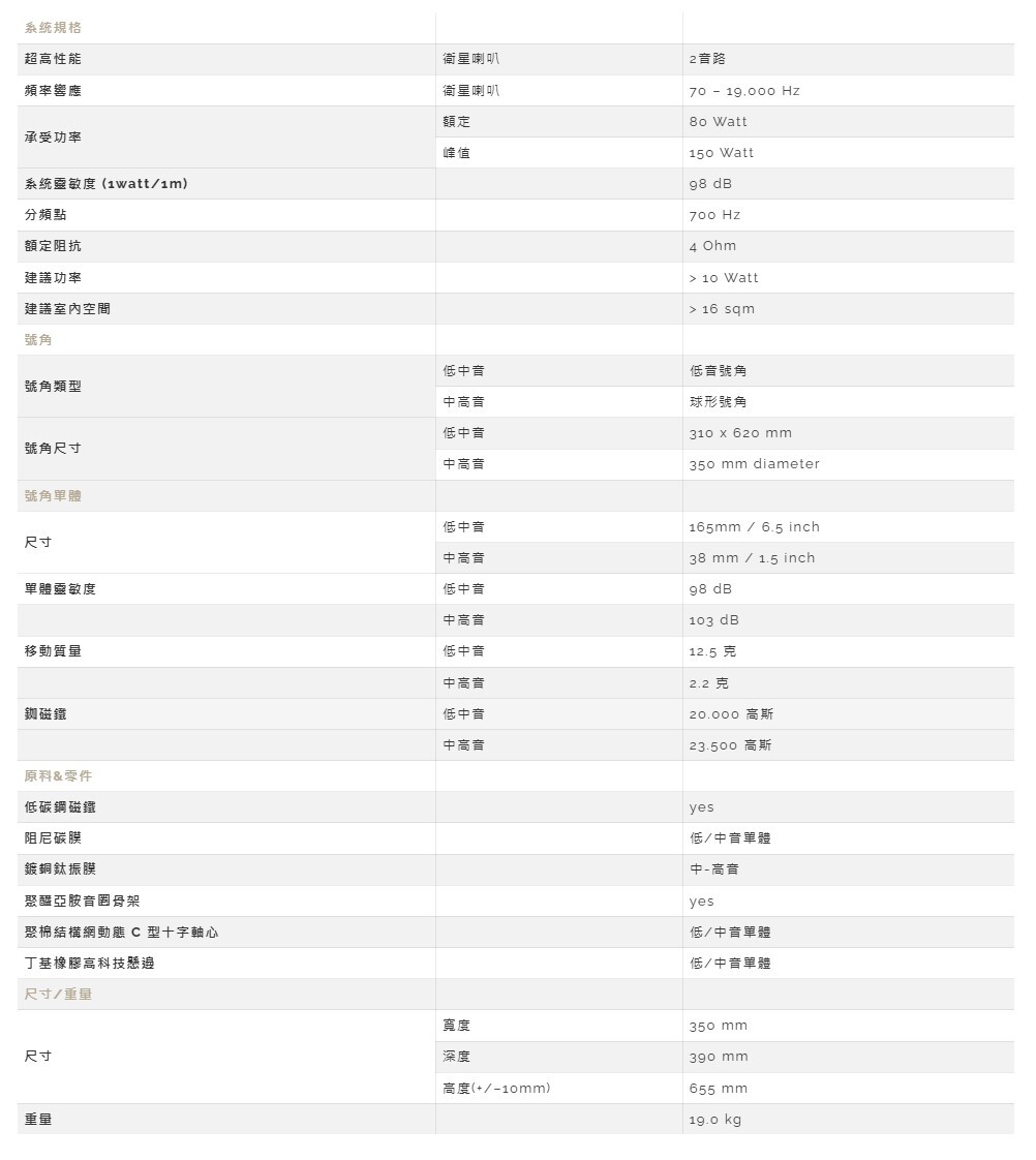 Avantgarde Colibri C2,以蜂鳥為靈感,將超高速振翅般的聲音反應融入設計。1.5吋中高音單體僅2.2g,搭配350mm號角開口,分頻點設於700Hz,提供超細膩延展的中高頻。雙6.5吋UL6.5低音單體僅12.5g、靈敏度高達98dB,低頻截止65Hz,若需更深沉延伸,可搭配專屬C18 18吋主動式超低音與C-AMP1200模組進行EQ調整。Colibri C2 除了優異聲學性能,外型吸睛、色彩可客製,體現Avantgarde 一貫的個性化哲學,是入門級號角喇叭的極致代表。