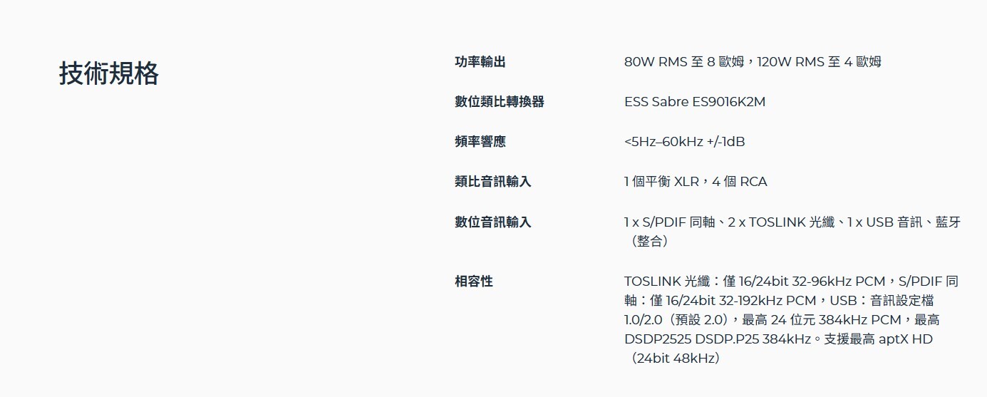 數位輸入 - TOSLINK、同軸和 USB 音訊輸入(來自 Mac/PC 的最高 24 位元/384kHz 和 DSD256 數位檔案)