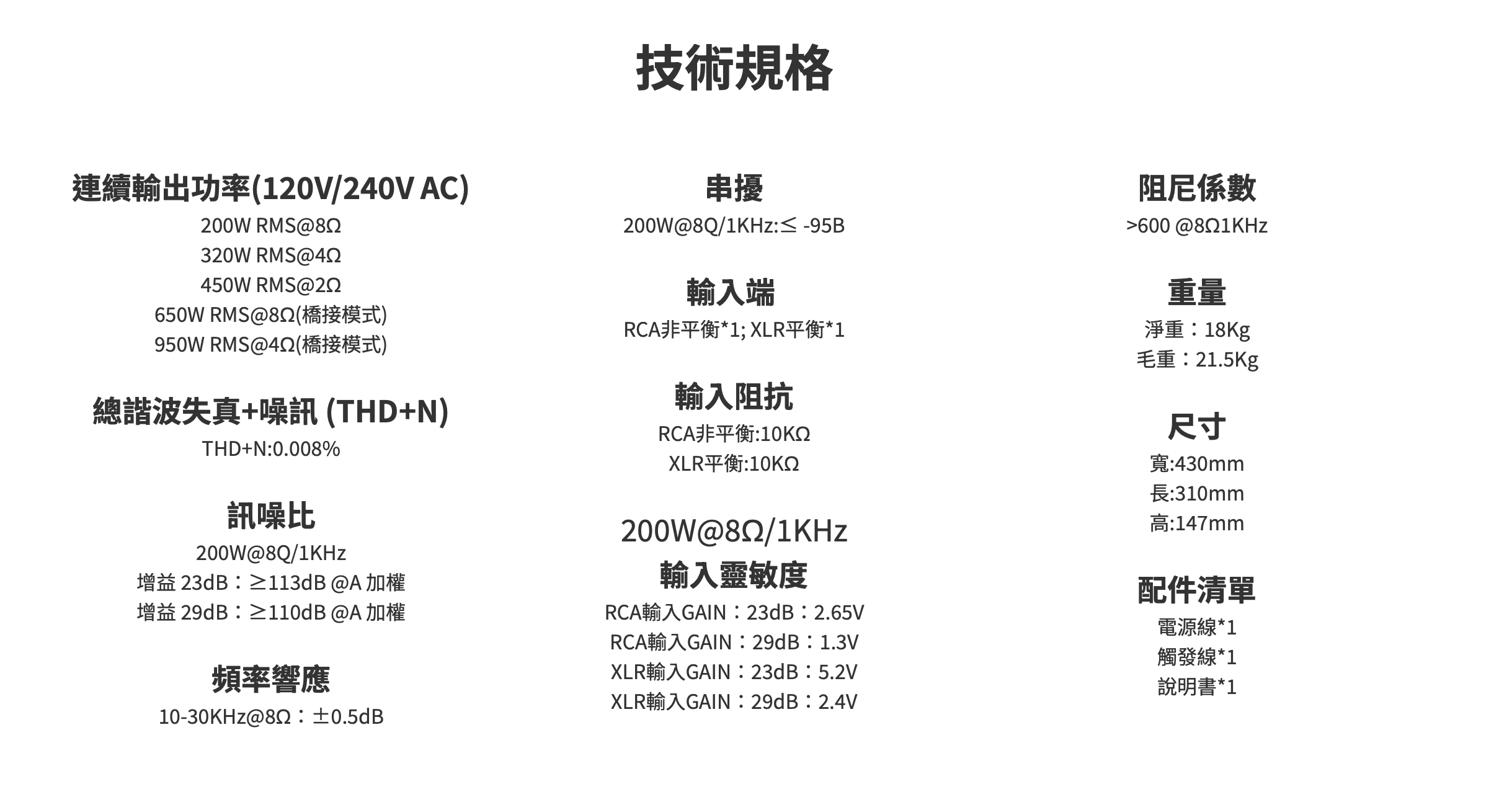 Eversolo AMP-F10 為一款 高效能 AB 類後級擴大機,採頂級電路設計與高品質元件,可提供每聲道約 200W(8Ω)與 320W(4Ω)輸出功率,在橋接模式下更可達 約 650W(8Ω)與 950W(4Ω) 之強勁驅動力,能輕鬆推動各類 Hi-Fi 喇叭系統。超低總諧波失真(≤0.008%)、高訊噪比(≥113dB)與高阻尼因數設計讓聲音清晰自然、動態反應敏捷。AMP-F10 配備平衡 XLR 與非平衡 RCA 輸入,靈活適配各種前級與訊源設備。台北音響提供實體展示與試聽服務,歡迎預約到店體驗其真實音質表現。