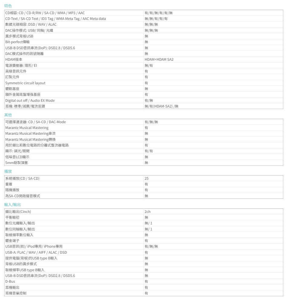 精巧的CD光碟播放機CD6007結合獨家的Marantz技術和優雅的造型,搭載參考級AK4490 192-kHz/24-bit的D/A轉換器,以及我們的HDAM-SA2(高動態擴大機模組)技術,提供純淨的音樂性能。中央安裝的CD驅動機制和CD、CD-R及CD-RW光碟相容,而USB-A端子甚至支援高解析的音訊格式,如:FLAC HD、DSD等。