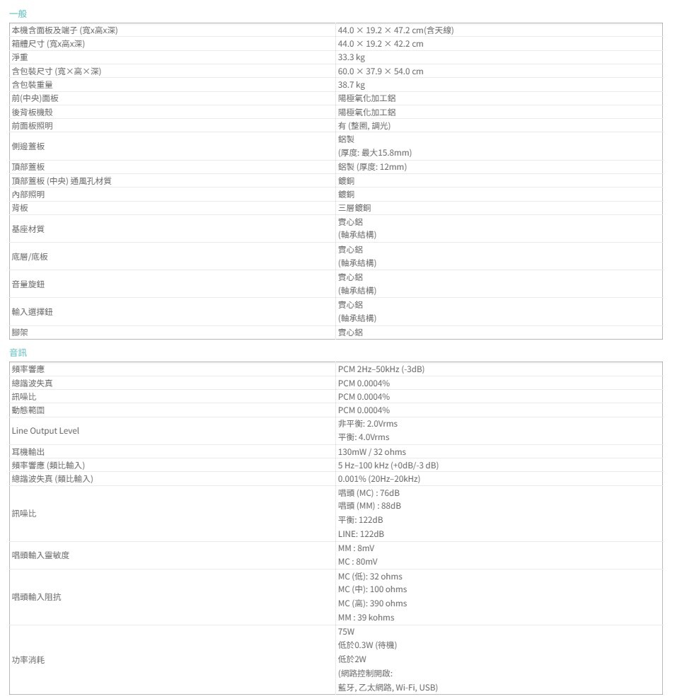 .類比輸入: Aux輸入x1, MM/MC唱頭輸入搭配可切換阻抗