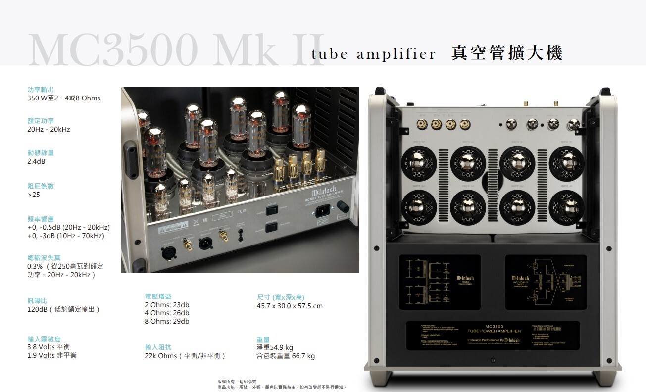 傳奇的 McIntosh MC3500 回歸!延續1960年代為NASA登月提供動力的經典真空管設計,MC3500 MK II 以八支EL509S輸出管釋放350W純淨音樂能量。結合經典面板與現代工程工藝,重現McIntosh最具代表性的聲學靈魂。現在於台北音響正式販售,極致重現音樂現場的震撼感與細節。