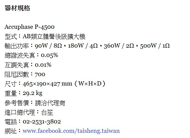 Accuphase P-4500 旗艦後級功放,結合高功率輸出、低失真設計與寬頻響應,呈現極致音場與精準動態。台北音響提供公司貨