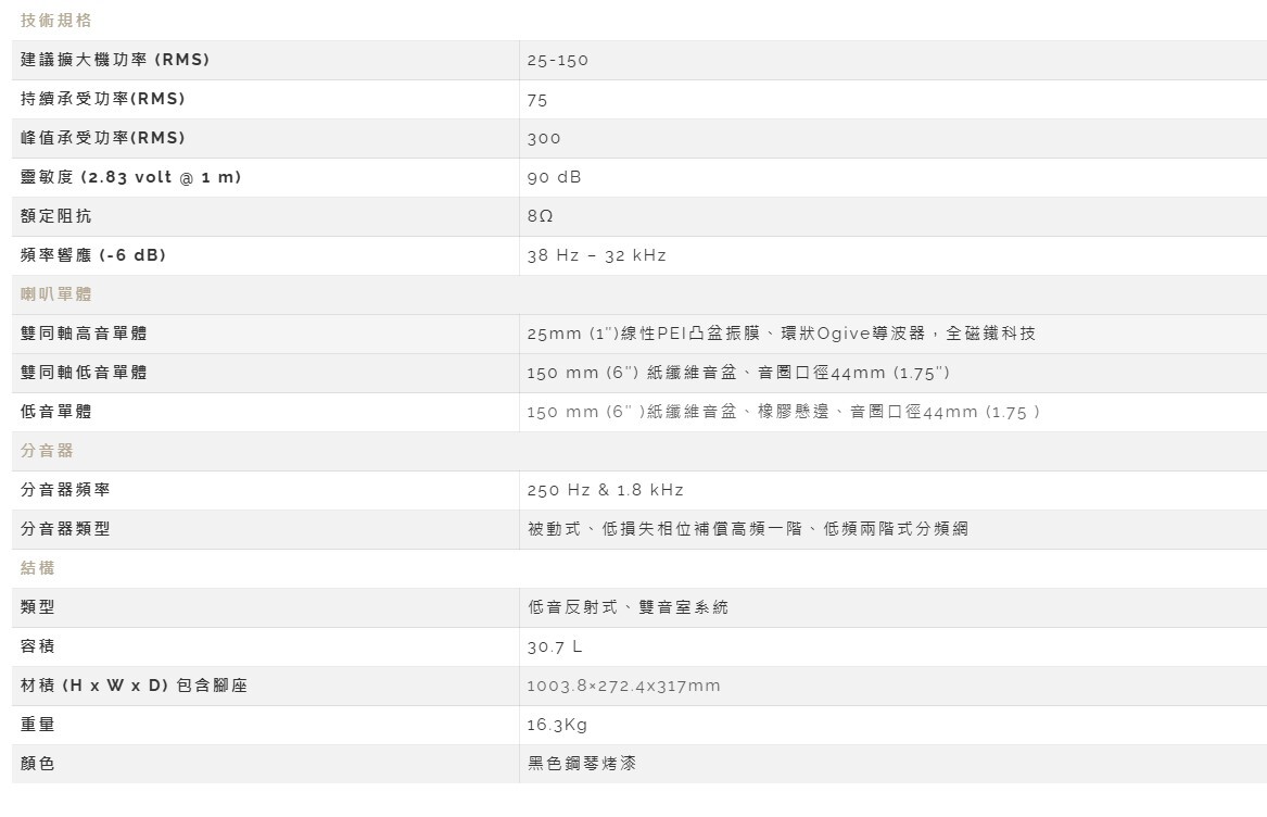 Dual Concentric 同軸+雙6吋低音,音場精準、低頻飽滿,中型空間兩聲道升級首選落地款。