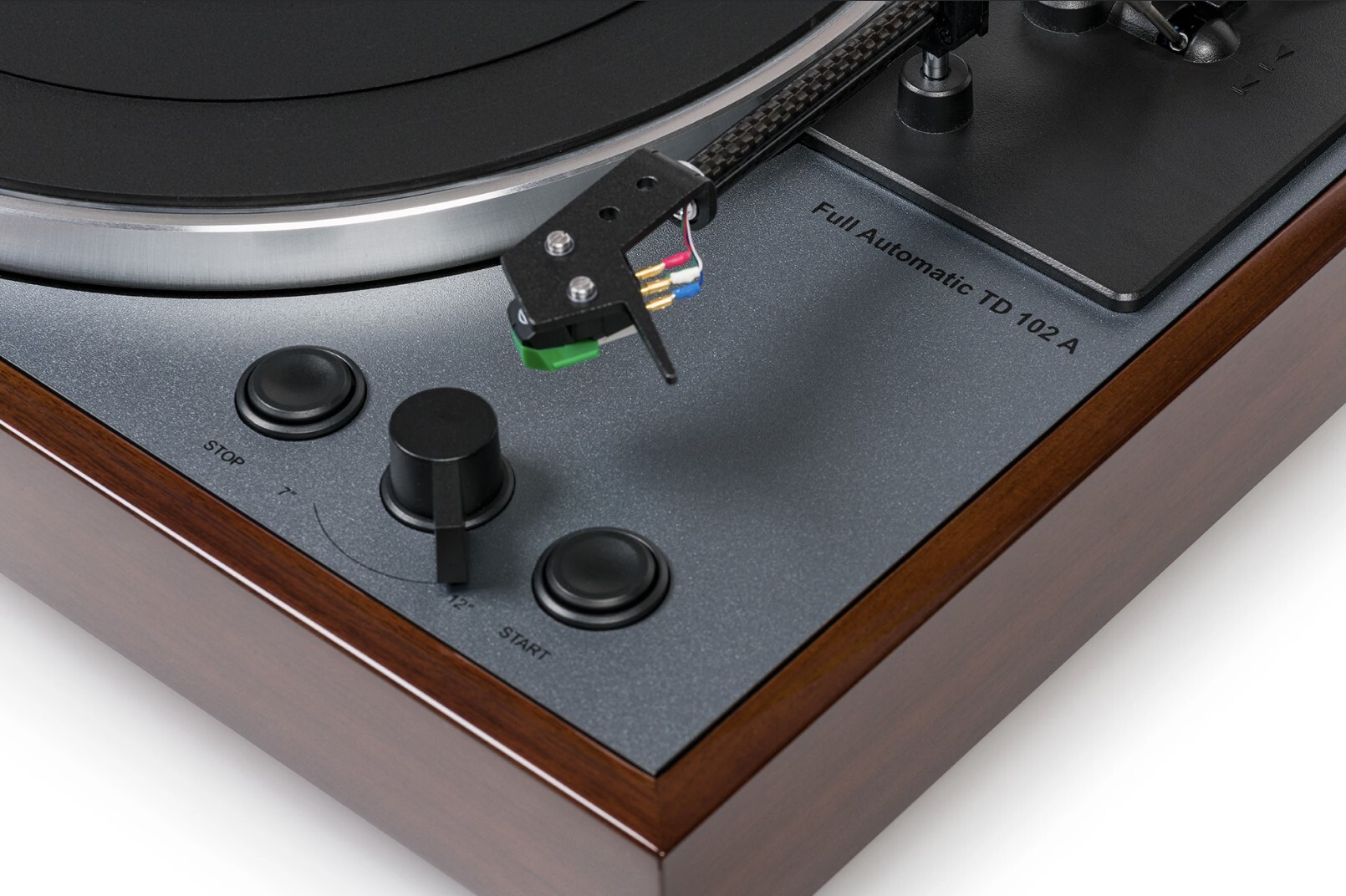 TD102A是一台全自動的入門級黑膠唱盤,只要你把訊號線接好,電源接上,放上唱片,按下播放鍵,就可以開始聽音樂了。唱臂會自動移動到唱片的音軌位置並且下針,整個播放過程就跟放CD一樣簡單,你不必小心翼翼地放唱臂,唱片播放完畢還會自動回臂,轉盤也會自動停止轉動。你覺得你是黑膠傻瓜嗎?聰明的Thorens TD102A幫你搞定所有事情。
